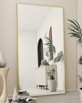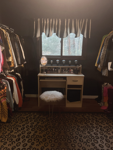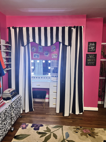 Once the painting was completed and the closet system installed, it was time for accessories. I added a vanity/beauty closet in what was the original bedroom closet, framed by black-and-white striped curtains from Amazon. An oversized floor mirror (also from Amazon) was a must for OOTD photos, and I re-purposed two black-and-white floral rolling carts from The Container Store for extra drawer space. (Unfortunately, these are no longer available.)